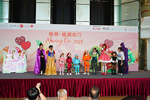 圖二:港基的義工與6位小義工以「白雪公主之未來之鏡」話劇為活動揭開序幕,向現場觀眾傳遞「助人為快樂之本」的訊息。